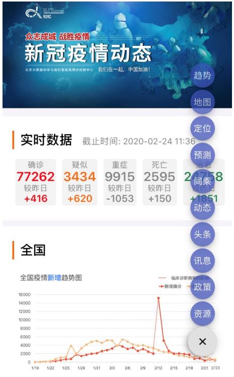 2016级高博班学生张帅(计算机学院),发挥自己专业技能,作为团队骨干参与开发了“众志成城·战胜疫情——新冠疫情实时数据360导航”信息服务平台(由北京市大数据科学与脑机智能高精尖创新中心(BDBC)和北航复杂系统可靠性实验室李大庆教授团队联合开发),该平台帮助公众快速获取最新、最全的疫情数据和政策资讯,并提供同乘查询、抗疫资源等多项服务,帮助大众理性认识疫情、科学防护疫情。
